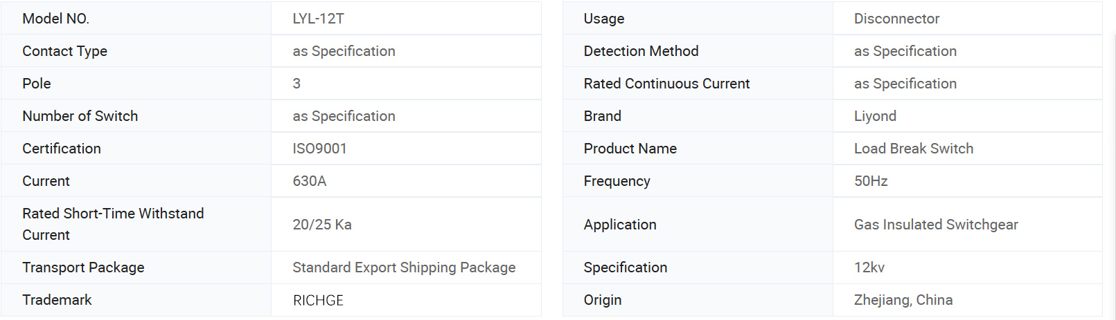 A LYL-12T terheléskapcsoló megfelel a GB3804-2004 "3,6kV~40,5kV nagyfeszültségű AC terheléskapcsoló" és a GB16926-1997 "AC nagyfeszültségű terheléskapcsoló-biztosíték kombinációs készülék" vonatkozó követelményeinek. Fő áramkör: 630A-20kA (4s), 25kA (3s); Mechanikai élettartam: 5000-szer; Földelő áramkör: 20kA (2s); Mechanikai élettartam: 2000-szer.