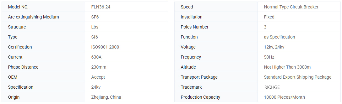 FLN36-24D Break-kapcsoló Az SF6 gázt ív oltásként és szigetelő közegként használja. Három munkaállomás van: a kapcsolóban történő megnyitás, bezárás és földelés. Kis hangerővel rendelkezik, telepítve könnyen használható, erős környezeti adaptabiliy és más tulajdonos.