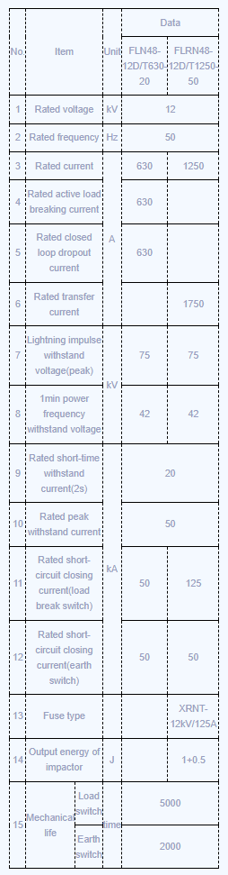 Az FLN48-12D típusú beltéri HV SF6 terhelési törés műszaki paraméterei