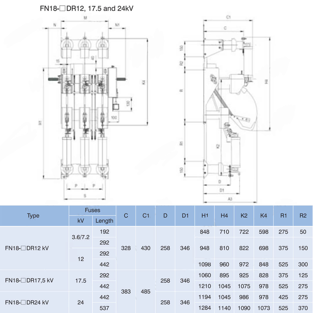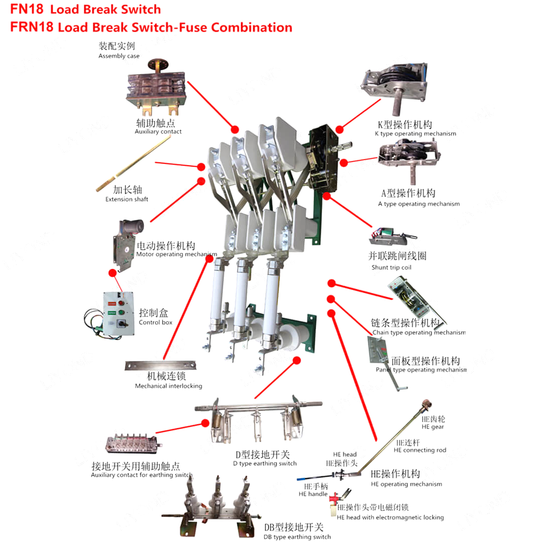 Az FN18 terheléskapcsolók és a terheléskapcsoló-biztosíték kombinációk nagyfeszültségű, nagy teljesítményű terheléskapcsolók, amelyek kombinálják a sűrített levegős ívoltást és a gázzal előállított ívoltást. A terheléskapcsoló és biztosíték kombinációja a terheléskapcsoló és a biztosíték előnyeit egyesíti, hogy a terheléskapcsoló névleges megszakítóáramáig bármilyen terhelési áramot kapcsoljon, és a biztosíték és ütközőjének működtetése révén a kombináció névleges rövidzárlati megszakítóáramáig bármilyen túláramot kapcsoljon.