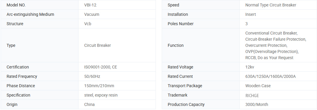A VBI-12 beltéri nagyfeszültségű vákuum-megszakító háromfázisú AC 50Hz, 12 kV-os beltéri eszköz névleges feszültsége. Ipari és bányászati vállalkozások, erőművek és alállomások esetén, mint elektromos berendezések ellenőrzése és védelmi céljai, valamint a hely gyakori üzemeltetése.