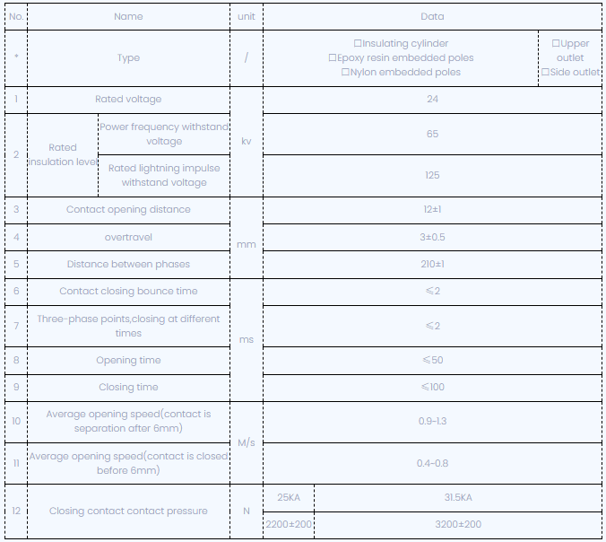 A VBI-24 oldalra szerelt típusú vákuum áramköri főzőpohár működési mechanizmusát a tároló energiához használják, amelyet kétféle módon, kézi vagy elektromos módon lehet működtetni. A jellemzők összhangban állnak a GB1984-89 , JB3855-96 <10kV beltéri nagyfeszültségű vákuum-megszakító általános műszaki előírások>, az IEC56 szabvány releváns rendelkezéseivel.