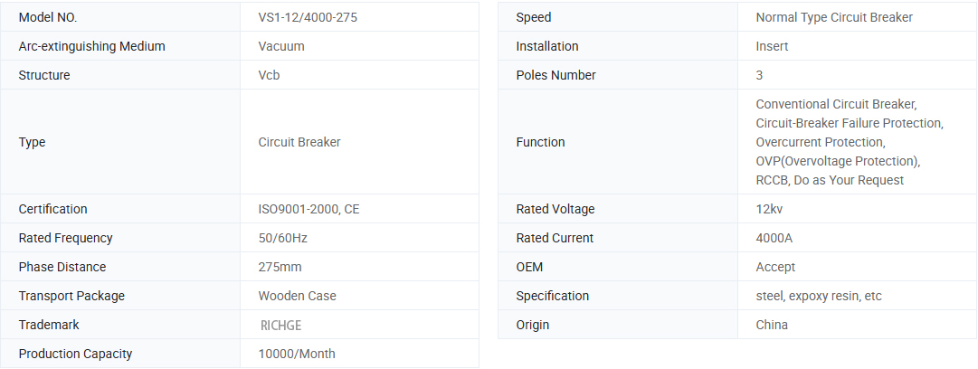 A VS1-12 típusú vákuum-megszakító egyfajta beltéri nagyfeszültségű kapcsolóeszköz, amelyet az AC háromfázisú 50 Hz frekvenciájú teljesítményrendszerében használnak, a 12KV névleges feszültségű feszültségként a védelem és a vezérlőegység.