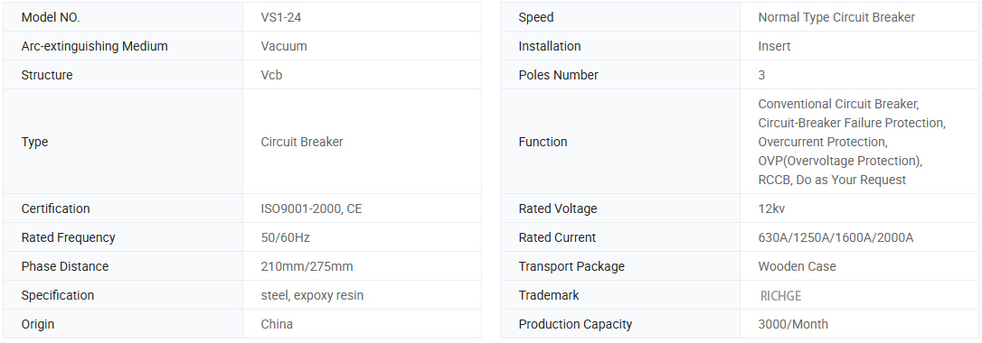 A VS1-24 beltéri nagyfeszültségű vákuum-megszakító sorozata, a közönséges szigetelt hengerrel, háromszoros A.C. 50 Hz-es beltéri energiaelosztó berendezés, 24 kV névleges feszültséggel. Az ipari és a bányászati vállalkozások, az erőművek és az alállomások területén lévő elektromos berendezések ellenőrzésének védelmére szolgál. Ez a típusú vákuumáram-megszakító megfelel a nemzeti szabványoknak és az IEC standard előírásainak, az M2-E2-C2 fokozat eléri.