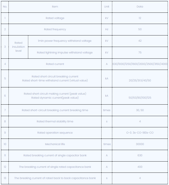 A VSG-12 típusú beltéri nagyfeszültségű vákuum-megszakító rugót használt a tároló energiához. A működési mechanizmust kétféle módon lehet működtetni, kézi és elektromotív működtetéssel, a jellemzők a GB1984-2003 nagyfeszültségű váltakozó áramú megszakítóval, JB3855-1996 3,6-4.5KV Beltéri AC nagyfeszültségű váltakozó áramú megszakító és IEC standard 62271-100: 200162271-100: 2001 High Volitage Circuit Circuit Cirtor Breaker és IEC Standard.