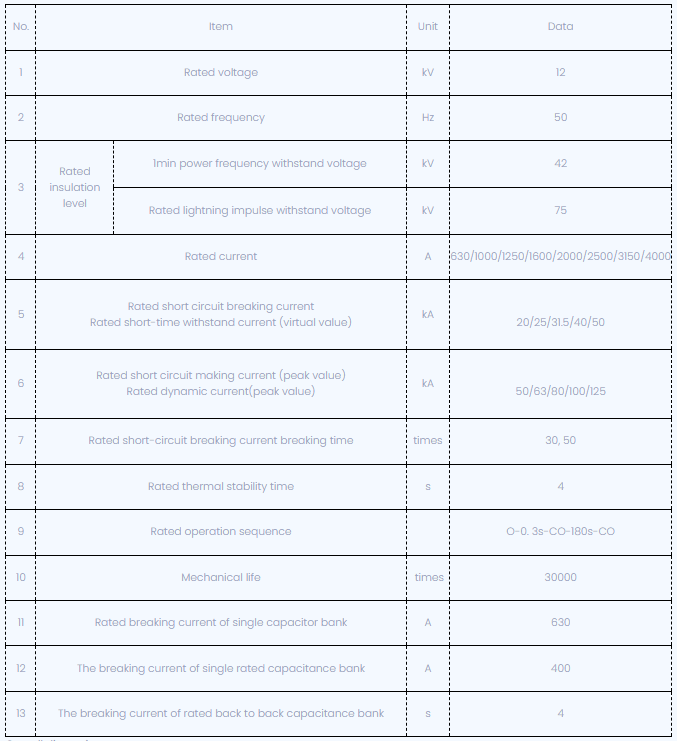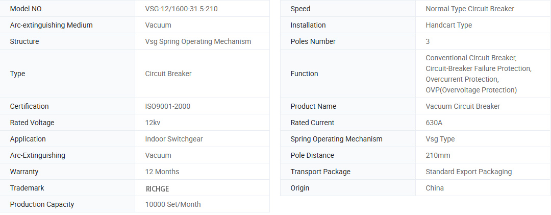 A VSG-12 típusú beltéri nagyfeszültségű vákuum-megszakító rugót használt a tároló energiához. A működési mechanizmust kétféle módon lehet működtetni, kézi és elektromotív működtetéssel, a jellemzők a GB1984-2003 nagyfeszültségű váltakozó áramú megszakítóval, JB3855-1996 3,6-4.5KV Beltéri AC nagyfeszültségű váltakozó áramú megszakító és IEC standard 62271-100: 200162271-100: 2001 High Volitage Circuit Circuit Cirtor Breaker és IEC Standard.