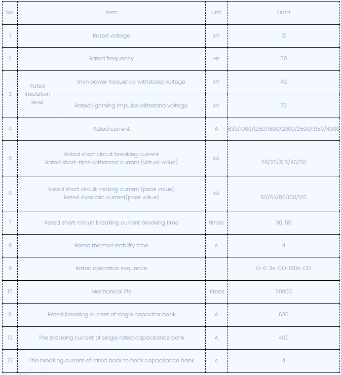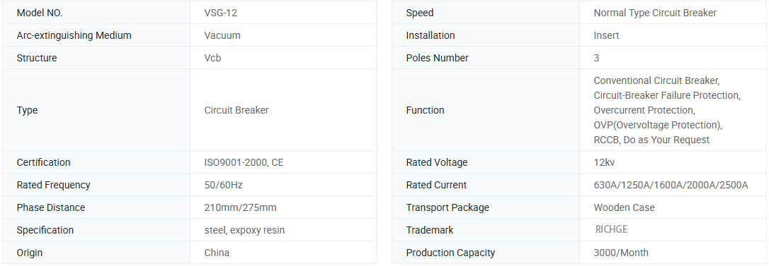 A VSG-12 típusú beltéri nagyfeszültségű vákuum-megszakító rugót használt a tároló energiához. A működési mechanizmust kétféle módon lehet működtetni, kézi és elektromotív működtetéssel, a jellemzők a GB1984-2003 nagyfeszültségű váltakozó áramú megszakítóval, JB3855-1996 3,6-4.5KV Beltéri AC nagyfeszültségű váltakozó áramú megszakító és IEC standard 62271-100: 200162271-100: 2001 High Volitage Circuit Circuit Cirtor Breaker és IEC Standard.