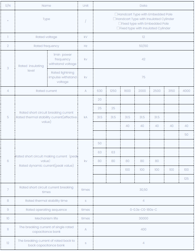 A beltéri kivonható vákuum-megszakítók alkalmasak háromfázisú váltóáramú teljesítményrendszerekre, 12 ~ 24kV-ig és 50/60 Hz frekvenciájú névleges feszültséggel. Ezeket széles körben használják erőművekben, alállomásokban, petrolkémiai anyagokban, kohászatban, gyártásban és más iparágakban, repülőterekben, lakóövezetekben stb. Vezérlés és védelem az elektromos berendezések védelme és védelme, különösen azoknál az esetekben, amelyeket ritkán kell működtetni a névleges áram- vagy többáramú rövidzárlaton. Telepíthető a beltéri levegőben szigetelt kapcsolóberendezésekbe, például a KYN28 vagy az AMS típusba.