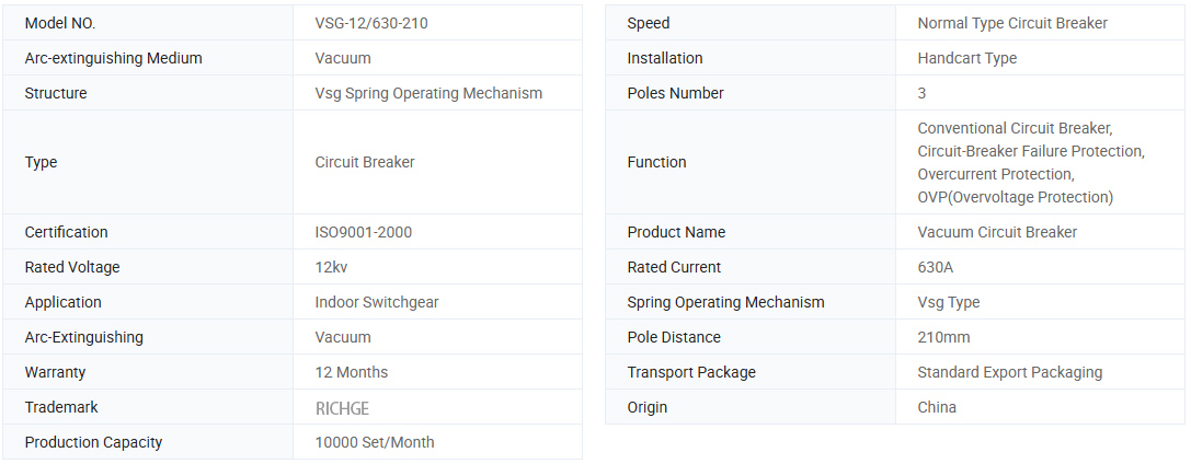 A VSG-12 beltéri nagyfeszültségű vákuum-megszakító (ABBR.: CIRVICTRE BEPER) háromszoros A.C. 50 Hz-es beltéri tápegység eloszlásával felszerelt 12 kV-os feszültséggel. Ez a termék összhangban van a GB1984-2003-val (nagyfeszültségű A.C. megszakító), JB3855-1996 (3,6-4,5 kV beltéri A.C. nagyfeszültségű áramköri megszakító), DL403-2000 (műszaki feltételek a 12-40,5 kV magas Voltage Cirtory Breaker) és az IEC 62271-11. megszakító). Használható a berendezések védelmére és vezérlésére a hálózati berendezésekben, valamint az ipari és bányászati vállalkozás dinamikus kialakításához. Ires a terhelés és a gyakori működés váltásához, különböző ingatlanokkal, valamint a rövidzárlati áram megszakításának sokszoros műveleteinek képességével.