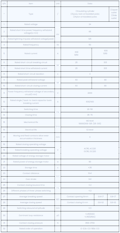 VSG-24C típusú oldalsó telepítés Beltéri nagyfeszültségű vákuum-megszakító rugót használt a tároló energiához. A működési mechanizmust kétféle módon lehet működtetni, kézi és elektromotív működtetéssel, a jellemzők a GB1984-2003 nagyfeszültségű váltakozó áramú megszakítóval, JB3855-1996 3,6-4.5KV Beltéri AC nagyfeszültségű váltakozó áramú megszakító és IEC standard 62271-100: 200162271-100: 2001 High Volitage Circuit Circuit Cirtor Breaker és IEC Standard.