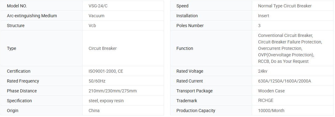A VSG-24C, az oldalsó beltéri nagyfeszültségű vákuum-megszakító alkalmas háromfázisú AC 50 (60) Hz, 24kV-os energiarendszerhez, ipari és bányászati vállalkozásokhoz, erőművekhez és alállomásokhoz, mint a terhelési áram, a túlterhelési áram és a hibaáram közötti váltás. Ez alkalmas gyakori működési alkalmakra. Széles körben használják erőművekben, villamosenergia -hálózatokban, petrolkémiai anyagokban, kohászatban, metrókban, repülőterekben, épületekben és egyéb projektekben.
